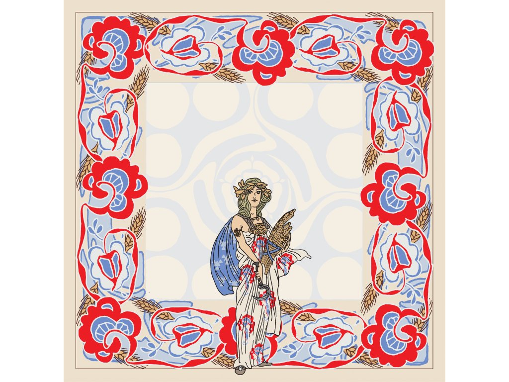 Kompozice šátku zachycuje Ceres obklopenou klasy obilí, granátovými jablky, vinnou révou a květy, které odkazují na plodnost a koloběh přírody. Zlatavé, zelené a teplé zemité tóny evokují zralé obilné lány, úsvit léta a mateřské teplo bohyně, jež dává život.