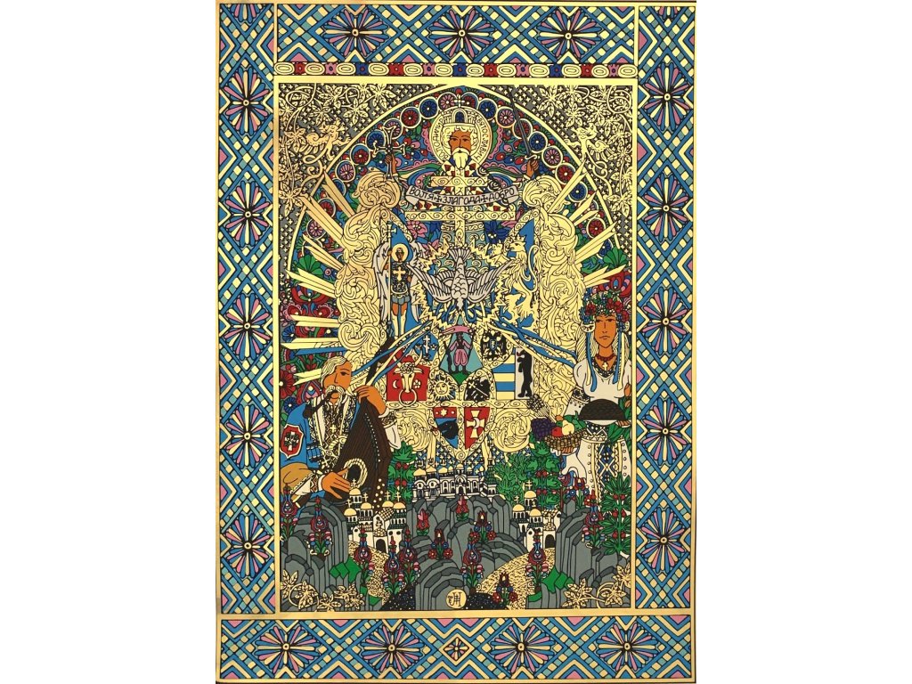 Umělecká grafika „Ukrajinci“ na zlaté fólii zachycuje kulturní a historickou esenci ukrajinského národa. Dominantním prvkem je tryzub s vyobrazením ukrajinských měst, nad ním svatý Vladimír Kyjevský sesílající požehnání. Obrazy s významem a příběhem pro sběratele i milovníky slovanského umění.