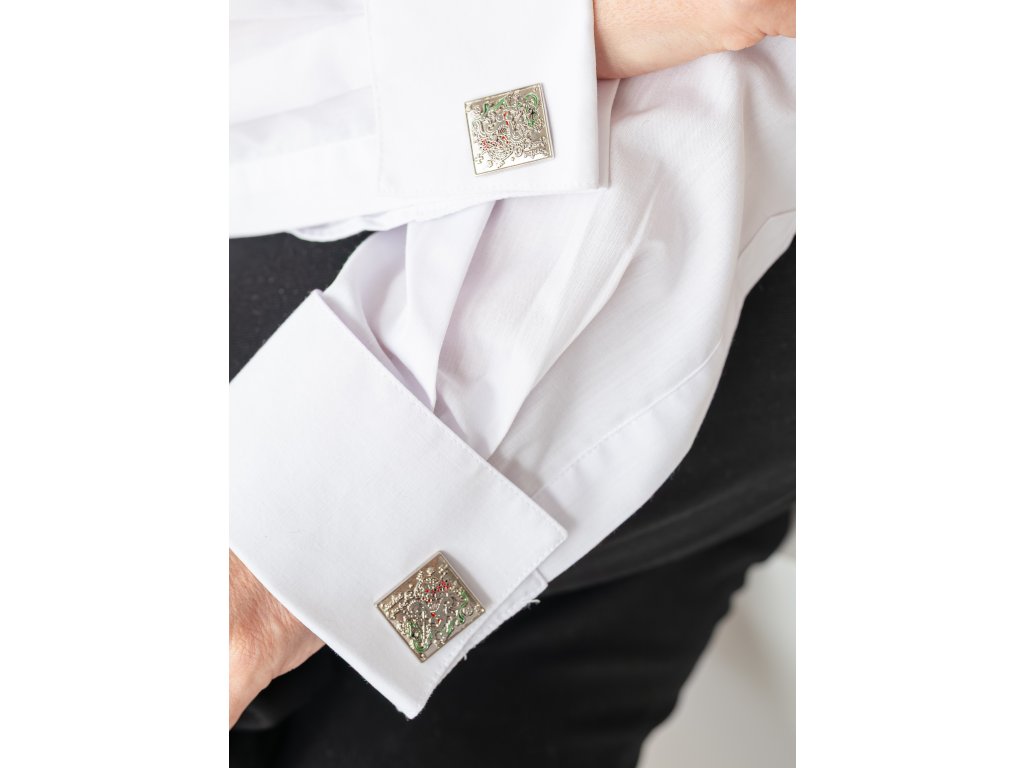 Stříbrné manžetové knoflíčky se symbolem sv. Jiří a draka – legendy o vítězství dobra nad zlem. Precizní česká výroba, ručně malované, originální design a dárková krabička. Unisex - vhodné pro ženy i muže.