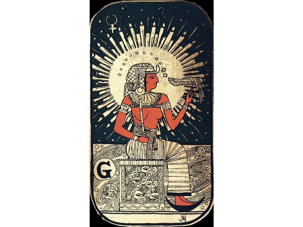 Umělecká grafika „Isis – Urania“ je jedinečný obraz na prodej, který zachycuje starověkou bohyni Isis-Uranie v pojetí evropské ezoterické tradice. Toto originální dílo ukazuje spojení řecko-egyptského božstva s křesťanským symbolem Panny Marie a odráží tak hluboké mystické propojení různých duchovních a filozofických směrů. Grafika je vytvořena sítotiskovou technikou na zlaté fólii, která zvýrazňuje jemné detaily a dodává obrazu výjimečný vzhled.