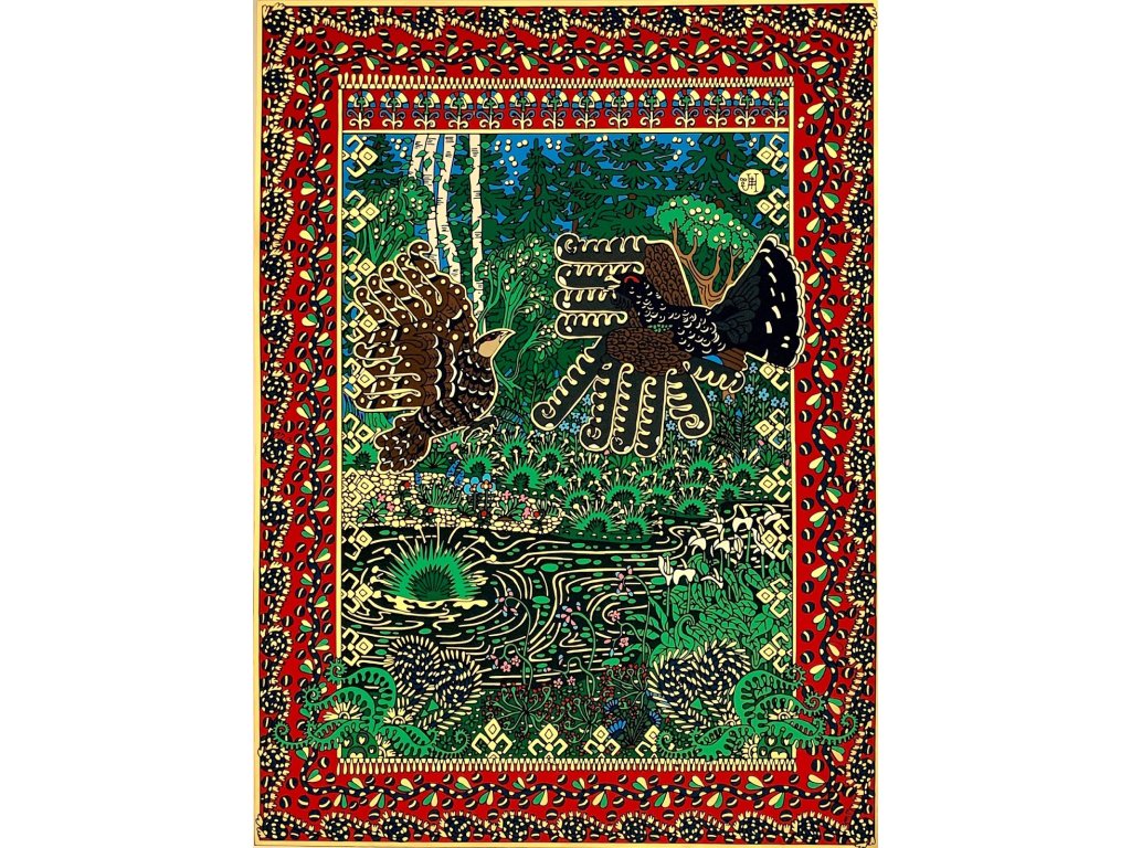Zlacený umělecký tisk inspirovaný mystickou atmosférou šumavských rašelinišť s motivem tetřevů. Grafika je součástí plánovaného cyklu s názvem Kouzlo šumavské přírody.