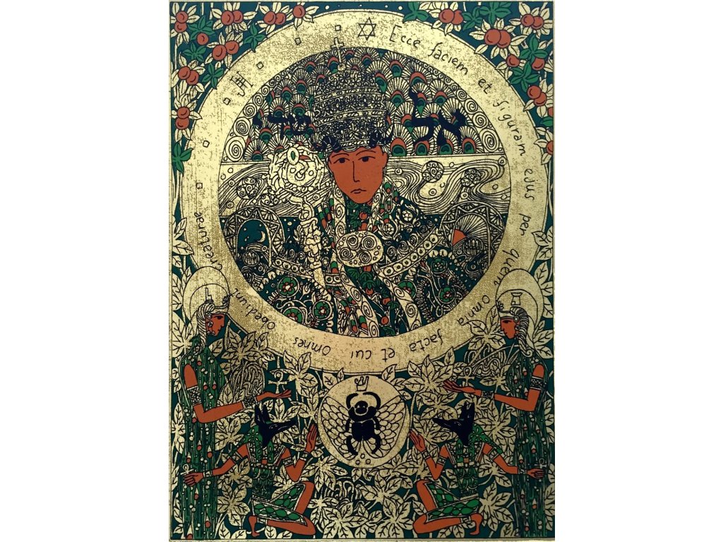 Tento obraz je inspirovaný a vytvořen podle první magické pečetě krále Šalamouna, známé svou mystickou silou a symbolikou. Je součástí mého cyklu Historia symbolica, který zkoumá historické a esoterické motivy skrze umělecké dílo. Každý obraz je umělecký sítotisk na zlatou fólii, vytvořen podle mého výtvarného návrhu.