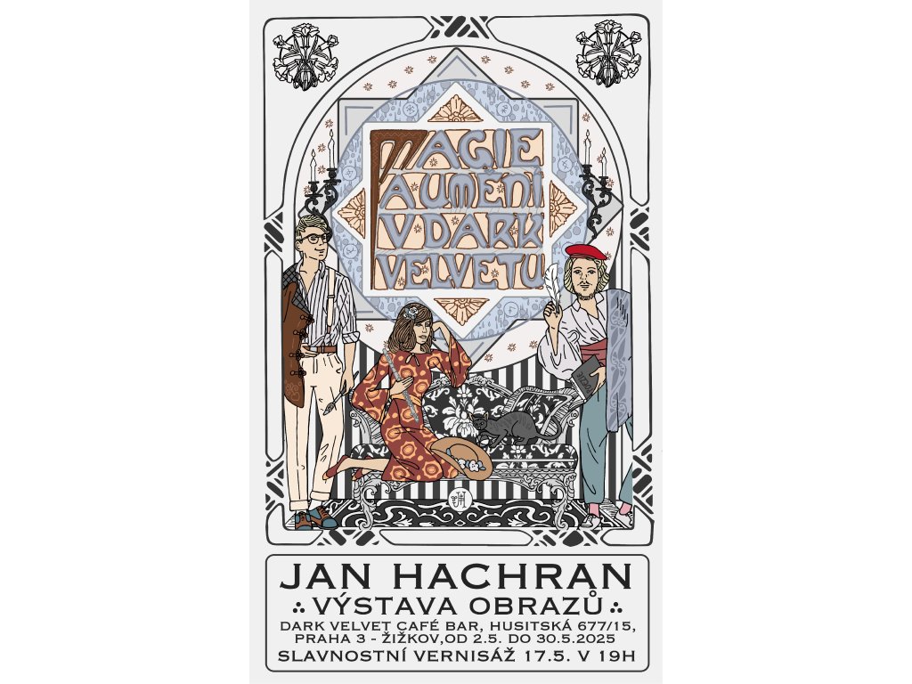 Plakát k výstavě Magie a umění v Dark Velvetu představuje jedinečné propojení mystiky, elegance a secesní estetiky tvorby Jana Hachrana. Limitovaná edice autorského tisku vytvořená k příležitosti výstavy v pražské kavárně Dark Velvet Café Bar.